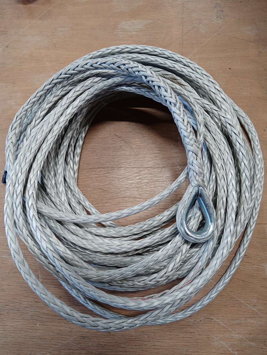 Dyneema SK75 vinssiköysi, päässä valmiiina koussi koukun kiinnittämistä varten. Murtolujuus 3670kg, köyden halkaisija 6mm. Köysi pleissattu pajallamme Kristiinankaupungissa, itse köysi valmistettu Hollannissa.
